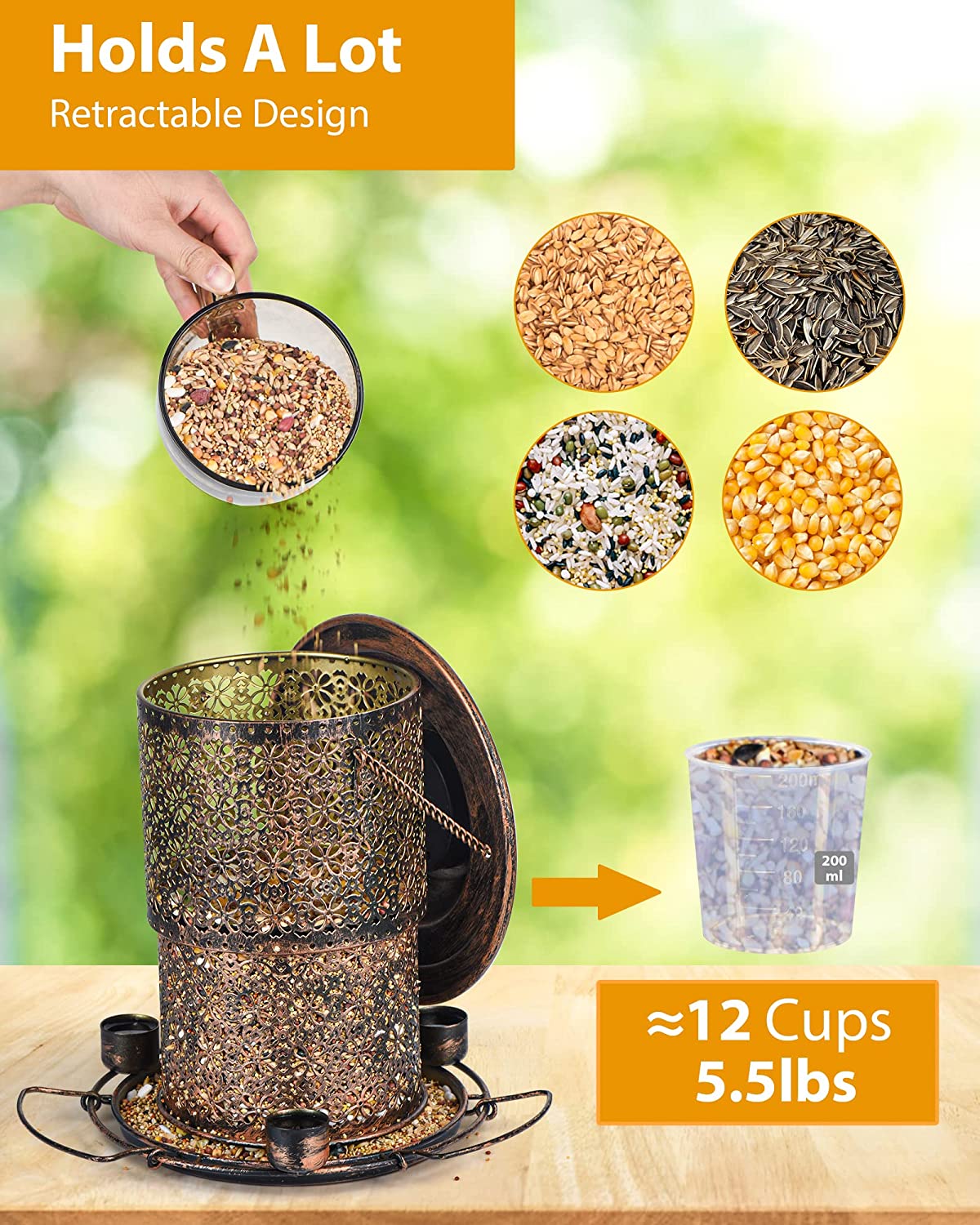 - 🦜[Easy To Refill & Clean] Our wild bird feeder is easy to refill and can be extended up and down. Simply extend up the bird feeder and fix it to fill with food. The hollow pattern design makes it convenient for you to take a look and see what the remaining level of food is, and when to refill. Meanwhile, it is easy to clean by flushing with water then drying out.